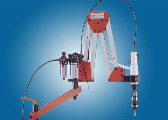 新型氣動攻絲機透孔或盲孔,絲攻均不致斷裂、氣動攻絲機特有的安全扭力夾筒使絲錐在攻絲中遇到盲孔時,自動打滑,保護了絲錐頭,高精度的絲錐保證了攻絲的高精度。